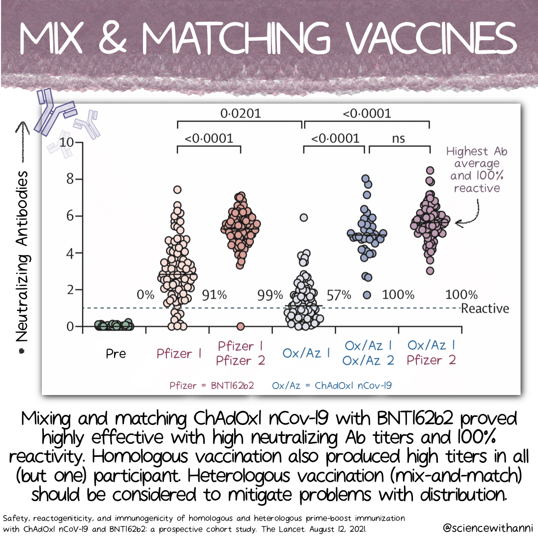 The conversation about mixing and matching vaccine types isn’t new but it’s still very important! With vaccine distribution problems and regional vaccine shortages across the globe, the topic of getting one dose of an mRNA-based vaccine and another dose of an Ad-based vaccine, remains pivotal. In this particular publication (The Lancet, August 12th), the immunogenicity and reactogenicity of heterologous vaccination with ChAdOx1 nCov-19 (Oxford/AstraZeneca) and BNT162b2 (Pfizer/BioNTech) is discussed.